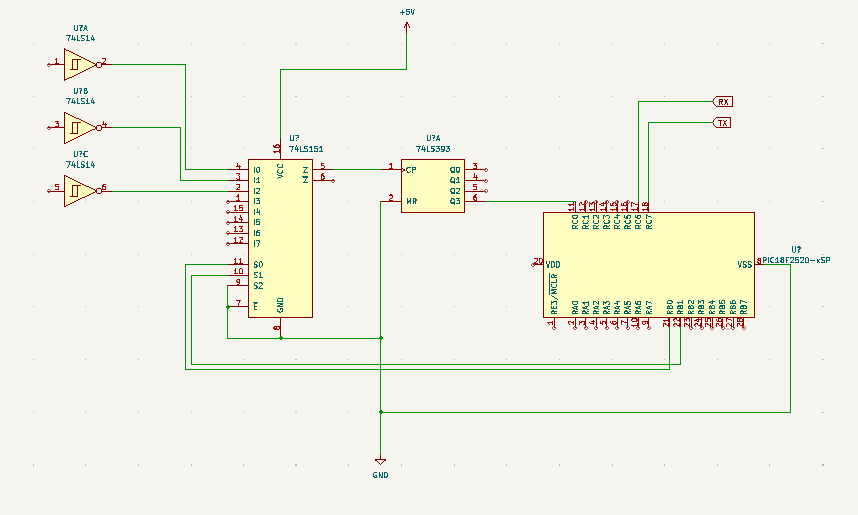 After that and since we have 3 signals and 1 counter we multiplex it with a 74151, this multiplexing is controlled by the pic on the 2 LSB of the input selectors.